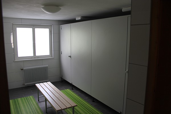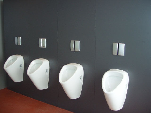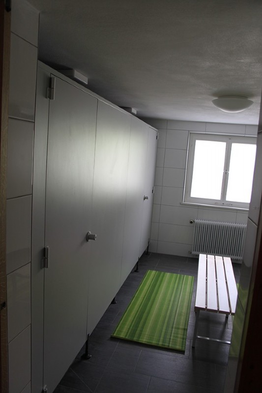 Die gesamte Anlage besteht aus 13mm starken, wasserunempflindlichen HPL-Platten mit beidseitiger rauhmatter Oberfläche. Alle sichtbaren Kanten sind gefräst und gerundet. Die Türanschläge sind gefälzt und flächenbündig ausgeführt. An der Schlossseite ist eine Gummidichtung eingefräst, um ein geräuscharmes Schließen der Türen zu gewährleisten. Als Bänder verwenden wir wartungsfreie Aluminiumbänder mit Laufflächen aus Hochleistungspolymer. Schließung mittels Drehriegelschloss aus Aluminium mit Rot-Weiss-Anzeige. Bei den Wandanschlüssen werden Aluminium-Profile 25/17mm montiert. Sie dienen zum Ausgleich der Toleranzen und als Abschluss der Trennwand.